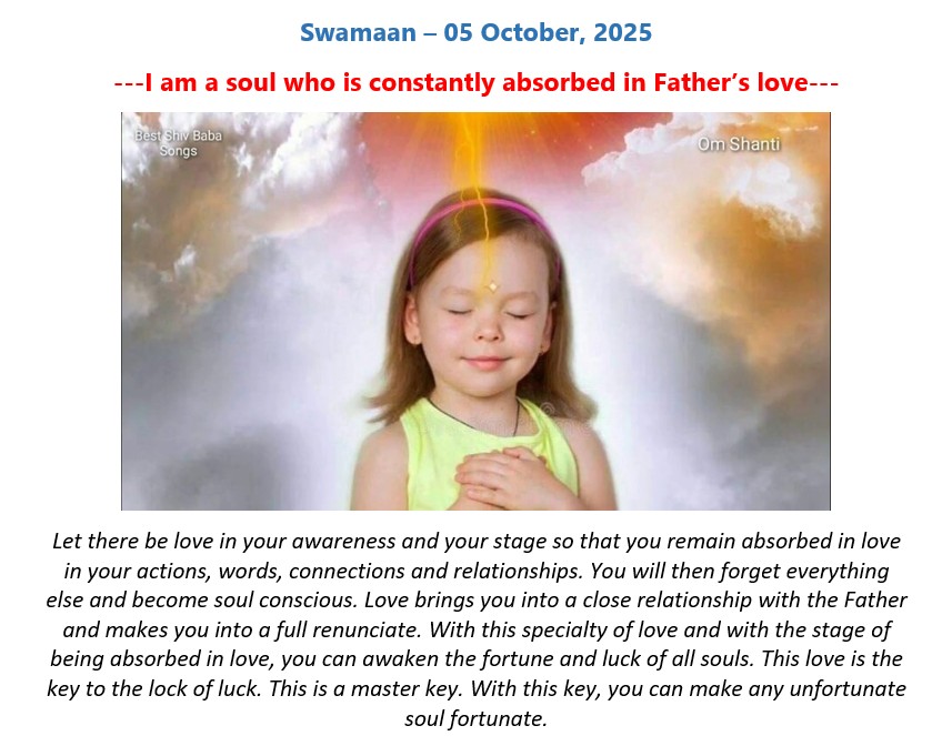 English Murli - 05.10.25 01. English Murli - Htm 02. English Murli - Pdf 03. English - GYDS Murli -Pdf 04. English Murli - Mp3 07. English Murli - Ess - SMS 25. Today Calendar 27. Swaman - Jpg Old Date - 04.10.25 Back Top