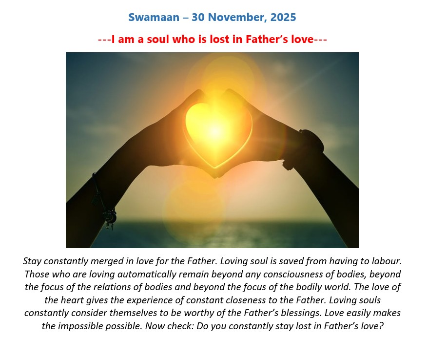 English Murli - 30.11.25 01. English Murli - Htm 02. English Murli - Pdf 04. English Murli - Mp3 05. Highlighted Murli - Pdf 07. English Murli - Ess - SMS 25. Today Calendar 27. Swaman - Jpg Old Date - 29.11.25 Back Top